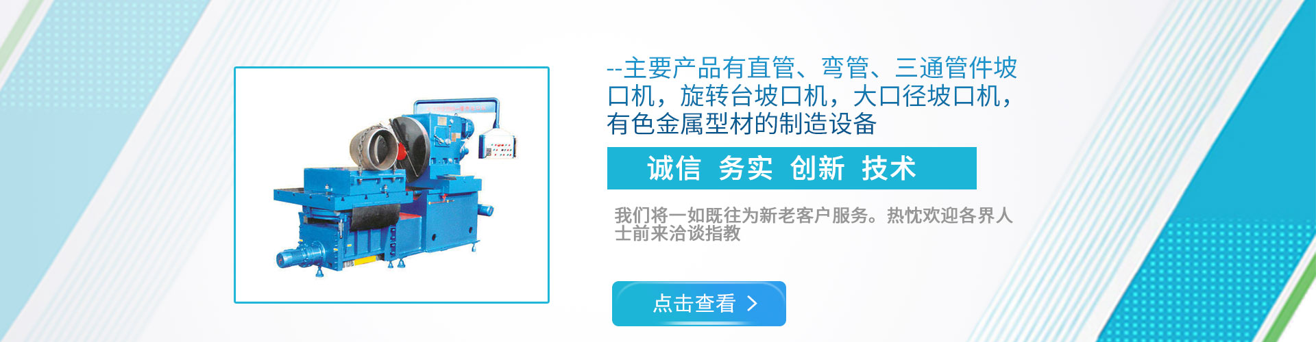 公司現(xiàn)下轄兩個(gè)分廠,一分廠主營(yíng)電動(dòng)管道坡口機(jī)和焊接設(shè)備,適用于造船、電力工程安裝、石油、化工、鍋爐廠、冶金以及鋼鐵行業(yè); 二分廠主營(yíng)雙頭坡口機(jī),600mm直管坡口機(jī)和金屬型材擠壓生產(chǎn)線,適用于銅、鋁、鎂、鉛、鋅等有色金屬及其合金的加工。
